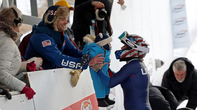 国际雪橇联合会世界锦标赛上,美国雪车运动员Kaillie Armbruster Humphries赛后抱着她的新生儿图片来源:IOC